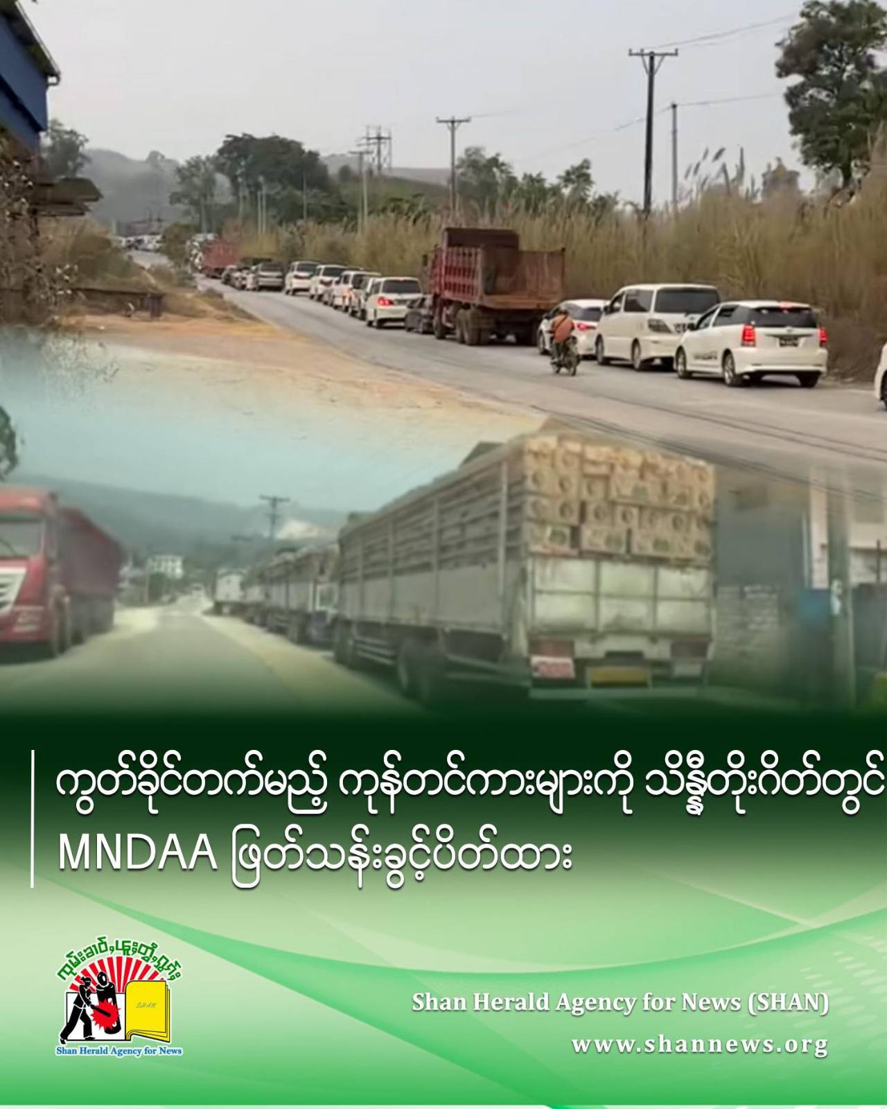 စိုင်းခွမ်မိန်း —သျှမ်းပြည် သိန္နီမြို့ရှိ အေးရှားဝေါလ်တိုးဂိတ်တွင် ကိုးကန့်တပ်ဖွဲ့ MNDAA မှ ကွတ်ခိုင်မြို့ဘက် သွားရောက်မည့် ကုန်တင်ကားများကို ဖြတ်သန်းသွားလာခွင့် ပိတ်ထားကြောင်း စုံစမ်းသိရသည်။