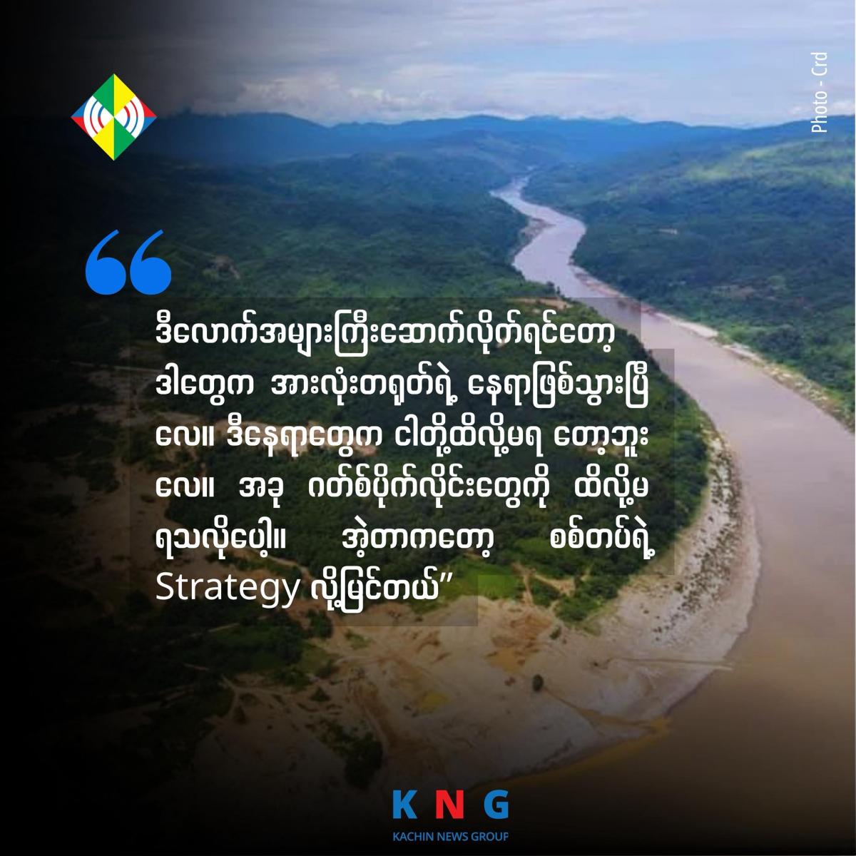 အမည် မဖော်လိုသည့် မြစ်ဆုံစီမံကိန်း ကန့်ကွက်သူတစ်ဦးက “မြစ်ဆုံလည်း နိုင်ငံရေးနဲ့တော်တော်လေး လင့်ခ်ဖြစ်တယ်လို့ ခံယူတယ်ပေါ့နော်။ ပြီးရင် စစ်ကောင်စီကလည်း သူတို့ရဲ့ထောက်ပံ့မှုတွေကို တရုတ်ဘက်က အားကိုးရသလို ကျမတို့ ကချင်ဘက်က တော်လှန်ရေးအဖွဲ့တွေကရော တရုတ်ရဲ့လွှမ်းမိုးမှုတွေပံ့ပိုးမှုတွေအများကြီးရှိနေတယ်ပေါ့နော်။ စိုးရိမ်မှုကတော့ အများကြီးပေါ့နော်” ဟု ဆိုသည်။