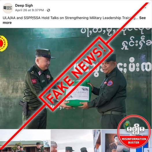 ဒါ့ကြောင့် အာရက္ခတပ်တော် (AA)နဲ့ ရှမ်းပြည်တိုးတက်ရေးပါတီ/ရှမ်းပြည်တပ်မတော် (SSPP/SSA) တို့ စစ်ဘက်ခေါင်းဆောင် အရည်အသွေးမြှင့်တင်ဖို့ တွေ့ခဲ့တယ်ဆိုတဲ့ သတင်းဟာ အမှန်တကယ် မဟုတ်ဘဲ အရင်ကပျံ့နှံ့ခဲ့တဲ့ ဓာတ်ပုံတွေနဲ့ လိုသလိုပုံဖော်ပြန်လည်ရေးသားဖြန့်ဝေထားတဲ့ သတင်းအမှားပဲ ဖြစ်ပါတယ်။