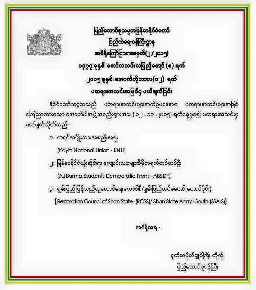 မြန်မာအစိုးရ အမိန့်ကြော်ငြာစာအမှတ်(၂/၂၀၁၅) အောက်တိုဘာ ၁၂ ရက်နေ့စွဲဖြင့် ကရင်အမျိုးသား အစည်းအရုံး(KNU)၊ မြန်မာနိုင်ငံလုံးဆိုင်ရာ ကျောင်းသားများ ဒီမိုကရက်တစ်တပ်ဦး (ABSDF)၊ ရှမ်းပြည်ပြန်လည်ထူထောင်ရေးကောင်စီ/ရှမ်းပြည်တပ်မတော် (RCSS/SSA)တို့ကို မတရား အသင်းကြေညာထားခြင်းမှ ပယ်ဖျက်လိုက်ခြင်းဖြစ်သည်။