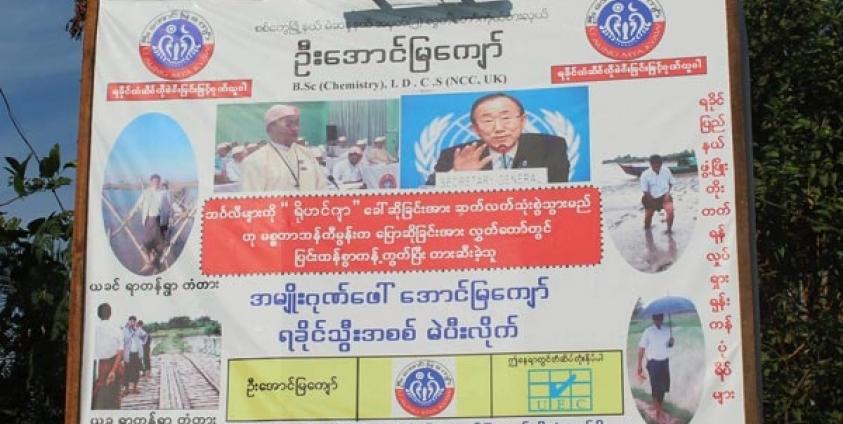ဦးအောင်မြကျော်၏ ပိုစတာနှင့် ဗီနှိုင်းများပေါ်တွင်လည်း ဘင်္ဂလီများကို “ရိုဟင်ဂျာ” ခေါ်ဆိုခြင်းအား ဆက်လက်သုံးစွဲသွားမည်ဟု မစ္စတာဘန်ကီမွန်းက ပြောဆိုခြင်းအား လွှတ်တော်တွင် ပြင်းထန်စွာ ကန့်ကွက်ပြီး တားဆီးခဲ့သူ “ အမျိုးဂုဏ်ဖေါ် အောင်မြကျော်” “ရခိုင်သွီးအစစ် မဲပီးလိုက်”ဟု စာတန်းကို ရေးသားဖေါ်ပြထားသည်ဟု သိရသည်။