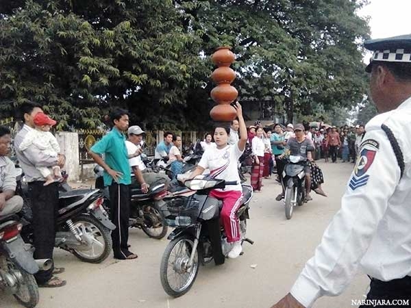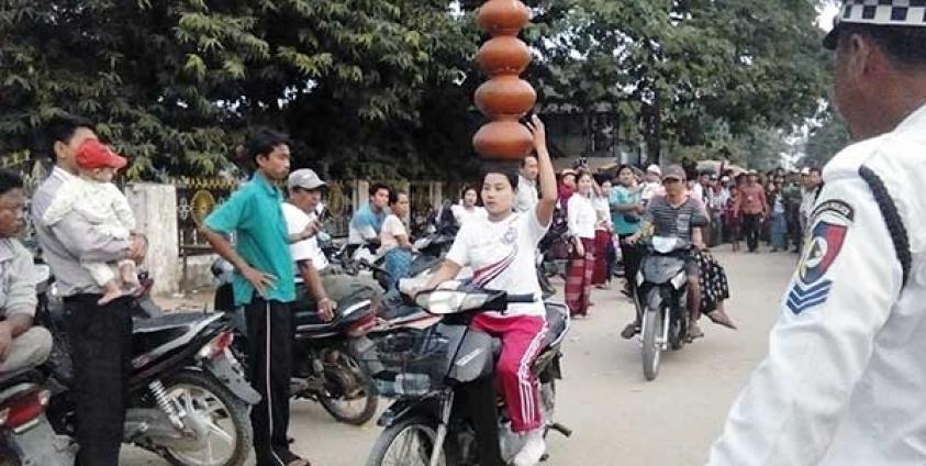 မြေသားဖြင့် ပြုလုပ်ထားသော ရေအိုးငါးလုံးကို အဆင့်လိုက်စီကာ ခေါင်းပေါ်တင်ပြီး ဆိုင်ကယ်စီးပြသူ အမျိုးသမီးမှာ ကျောက်ဖြူမြို့ စေတီတောင်ရပ်ကွက်မှ မမိစုဝေ(ခ)မမိစုနိုင် ဖြစ်သည်။