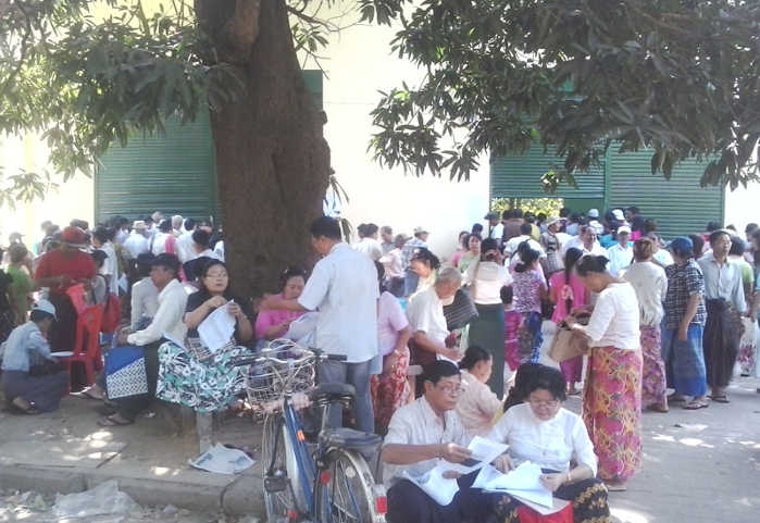 ရန်ကုန်တိုင်းအစိုးရအဖွဲ့ရုံးက တိုက်ခန်းနှင့် မြေကွက်လျှောက်ရမည့် လျှောက်လွှာတစ်စောင်လျှင် တစ်ထောင်ကျပ်ဖြင့် ရောင်းချပေးပြီး၊ လိုအပ်သည့် စာရွက်စာတမ်းများနှင့်အတူ လျှောက်လွှာတင် ရမည့်နေရာတွင် တိုးဝှေ့စီတန်းနေကြခြင်းဖြစ်သည်။