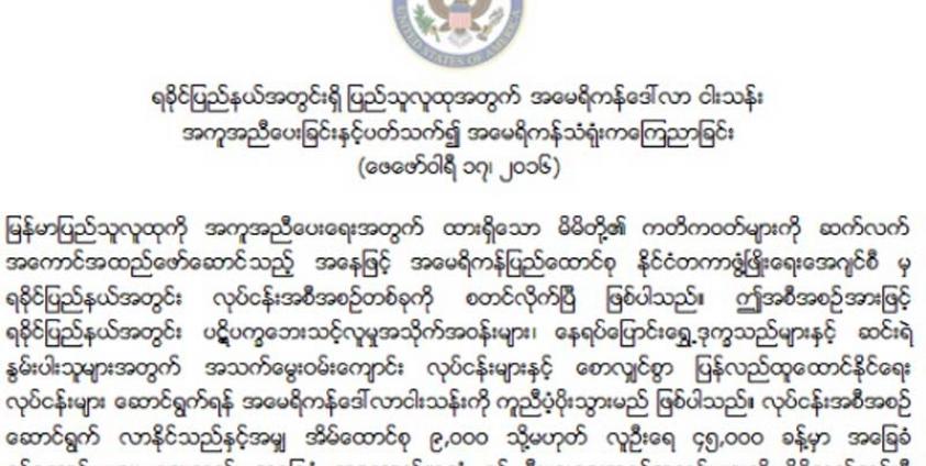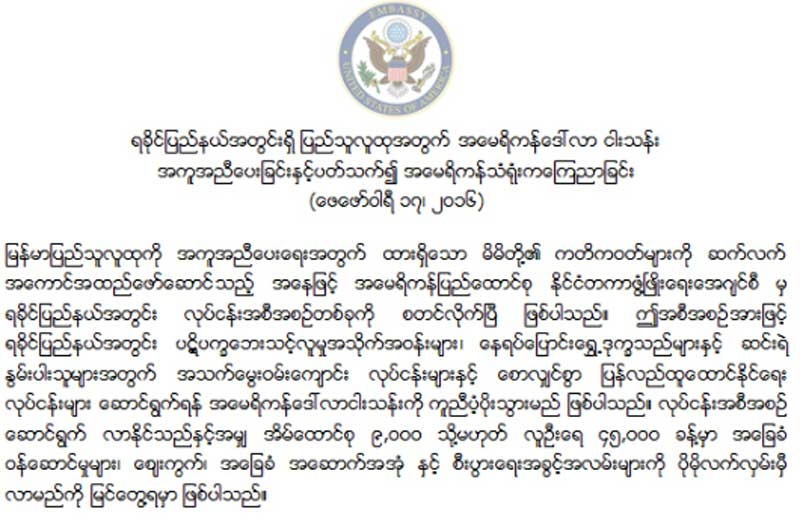 မြန်မာပြည်သူလူထုကို အကူအညီပေးမည်ဟု ပေးထားသည့် ကတိကဝတ်များကို ဆက်လက် အကောင်အထည် ဖော်ဆောင်သည့် အနေဖြင့် ရခိုင်ပြည်နယ်အတွင်း ပဋိပက္ခဘေးသင့် လူမှုအသိုက်အဝန်းများ၊ နေရပ်ပြောင်းရွှေ့ ဒုက္ခသည်များနှင့် ဆင်းရဲ နွမ်းပါးသူများအတွက် ရည်ရွယ်သည်ဟု ရန်ကုန်ရှိ အမေရိကန်သံရုံးက ဖေဖော်ဝါရီ ၁၇ ၌ ထုတ်ပြန်သည်။
