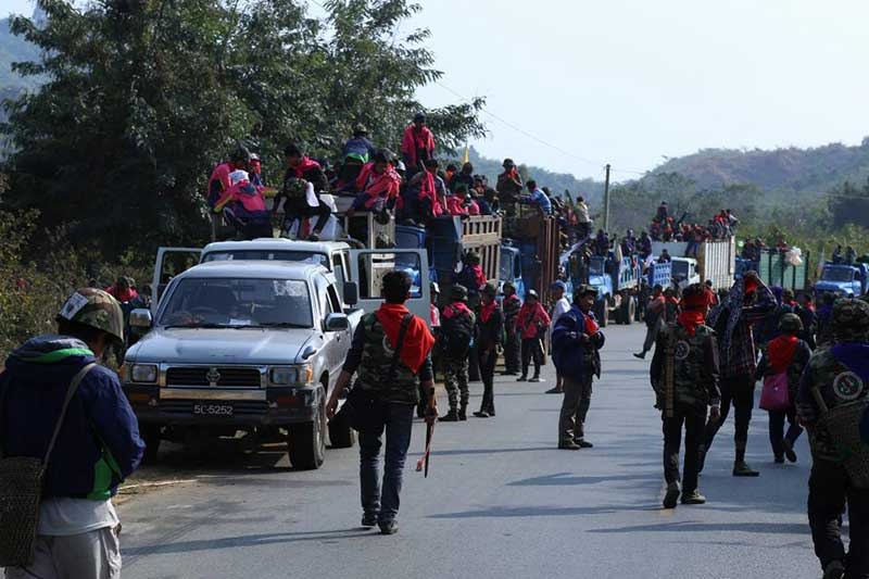 ဝါရှောင် အလွန် ဂေါ်စက်ယန်ကျေးရွာက အစုုိးရတပ်စခန်းကနေ ဖြတ်သန်းခွင့် မရ၍ စောင့်နေကြပုံ။ (ဓာတ်ပုံ -Htoi Awng Galau Lang Ting)