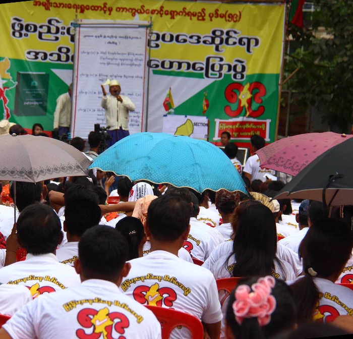 “ဒီမိုကရေစီကို သွားနေတဲ့နေရာမှာ ဒီမိုကရေစီရယ် လူ့အခွင့်အရေးရယ်၊ အမျိုးသားရေးရယ် ဒီသုံးခုကိုချိန်ထိုးပြီးတော့ အမျိုးသားရေးအမြင်ကိုလည်းမပစ်ပယ်ဘဲနဲ့ ဘယ်အရာကိုပဲလုပ်လုပ် လုပ်သင့်တယ်လို့ယုံကြည်ပါတယ်” ဟု ပုဒ်မ ၅၉ပါ အချက်များကို ရှင်းလင်းဟောပြောသော အမျိုးသားကွန်ယက်မှ ဥက္ကဋ္ဌ ကိုဝင်းကိုကိုလတ်က ပြောသည်။