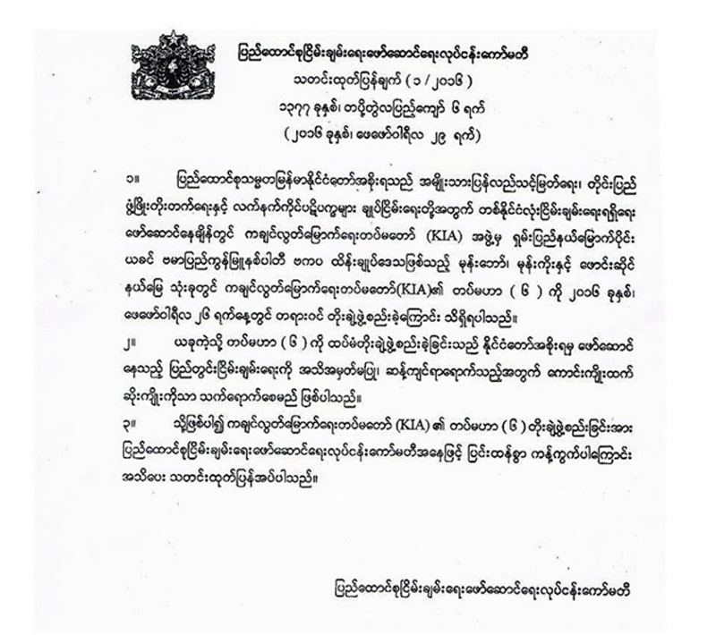 “KIA ၏ တပ်မဟာ ၆ တုုိးချဲ့ဖွဲ့စည်းခြင်းအား ပြည်ထောင်စုု ငြိမ်းချမ်းရေးဖော်ဆောင်ရေး လုုပ်ငန်းကော်မတီအနေဖြင့် ပြင်းထန်စွာ ကန့်ကွက်ပါကြောင်း” ပြည်ထောင်စုု ငြိမ်းချမ်းရေး ဖော်ဆောင်ရေး လုုပ်ငန်းကော်မတီက ဖေဖော်ဝါရီလ ၂၉ ရက်က သတင်း ထုုတ်ပြန်ထားသည်။