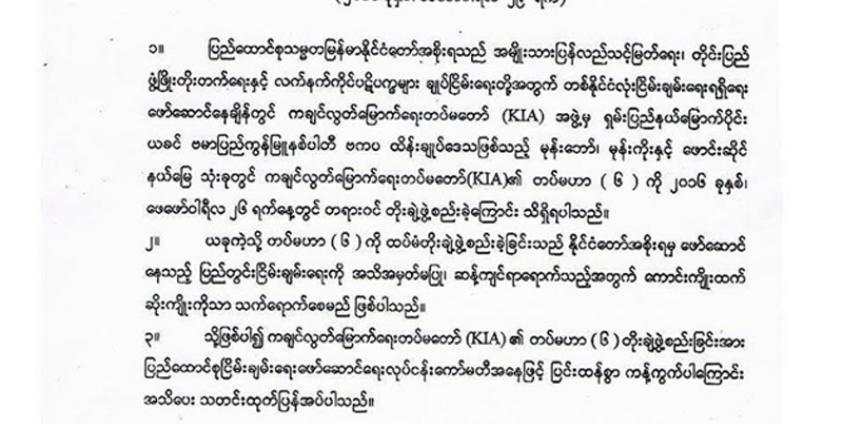 ရှမ်းပြည်နယ်မြောက်ပုုိင်း ကချင်လွတ်လပ်ရေးအဖွဲ့ (KIA) တပ်မဟာ ၆ အား တုုိးချဲ့ဖွဲ့စည်းလုုိက်ခြင်းကုုိ ပြည်ထောင်စုု ငြိမ်းချမ်းရေး ဖော်ဆောင်ရေးလုုပ်ငန်း ကော်မတီက ဖေဖော်ဝါရီလ ၂၉ ရက်က ကန့်ကွက်လုုိက်သည်။
