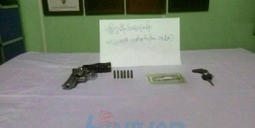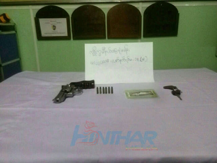 အဆိုပါ ယာဉ်မောင်း ဦးခင်မောင်မြင့်အား ရဲစခန်းသို့ ဖမ်းဆီးခေါ်ဆောင်၍ စစ်ဆေးရှာဖွေခဲ့ရာ ယာဉ်၏ အနောက်ခန်း ညာဘက် ထိုင်ခုံအောက်တွင် သိုဝှက်ထားသော ပွိုင့် (၃၂) ဘို့လ်ဆုံလည်အမျိုးအစား သေနတ်ကိုယ်ထည်အမှတ် 13L 57534၊ သေနတ်ဒင်ဖိုက်ဘာကိုယ်ထည်တွင် WG တံဆိပ်ပါ ကျည်ဆံ ခြောက်တောင့်ထည့်ထားသည့် ခြောက်လုံးပြူး သေနတ် တစ်လက်ကို ရှာဖွေတွေ့ရှိခဲ့ကြောင်း ၎င်းက ဆက်လက်ပြောသည်။