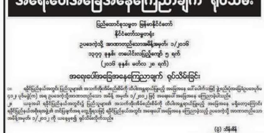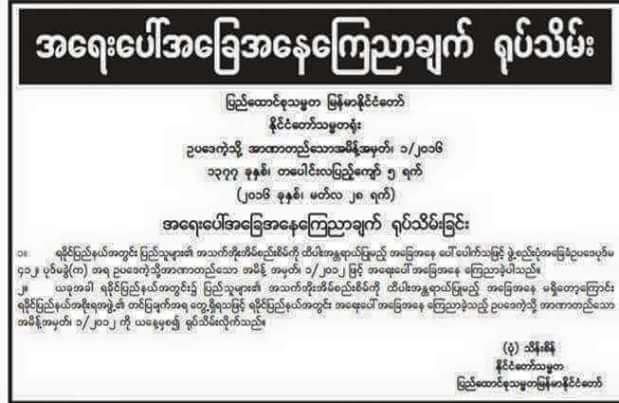 “ ရခိုင်ပြည်နယ် တည်ငြိမ်အေးချမ်းလာတဲ့ အတွက် အရေးပေါ် ဥပဒေ ထုတ်ပြန်ကြေညာချက်ကို ရခိုင်ပြည်နယ် အတွင်း ရုပ်သိမ်းလိုက်တာ မှန်ပါတယ်။ ဒါပေမယ့် မောင်တောခရိုင် အတွင်းမှာ ထုတ်ထားတဲ့ ညမထွက်ရ အမိန့်ကို ရုပ်သိမ်းလိုက်တာ မဟုတ်ဘူး။ ညမထွက်ရ အမိန့် ပုဒ်မ ( ၁၄၄) ဆိုတာက နှစ်လ တစ်ကြိမ် ထုတ်ပြန်ထားတဲ့ ဒေသန္တရ အမိန့် ဖြစ်ပါတယ်။ ဒါကို ကွဲကွဲပြားပြား သိဖို့ လိုအပ်ပါတယ်” ဟု ဆိုသည်။