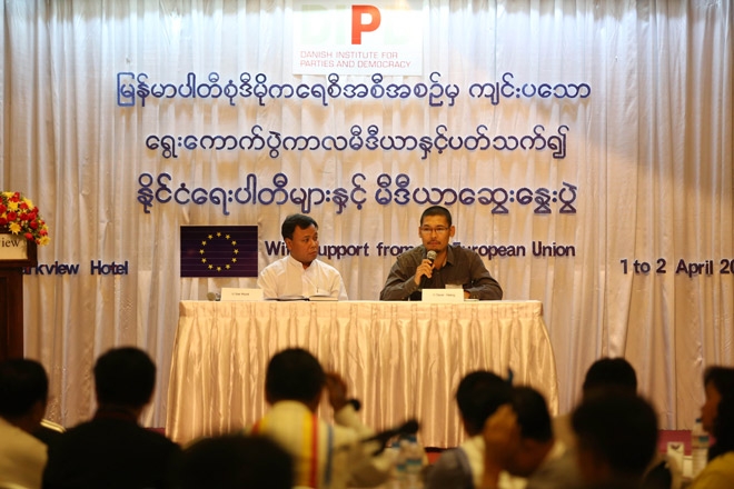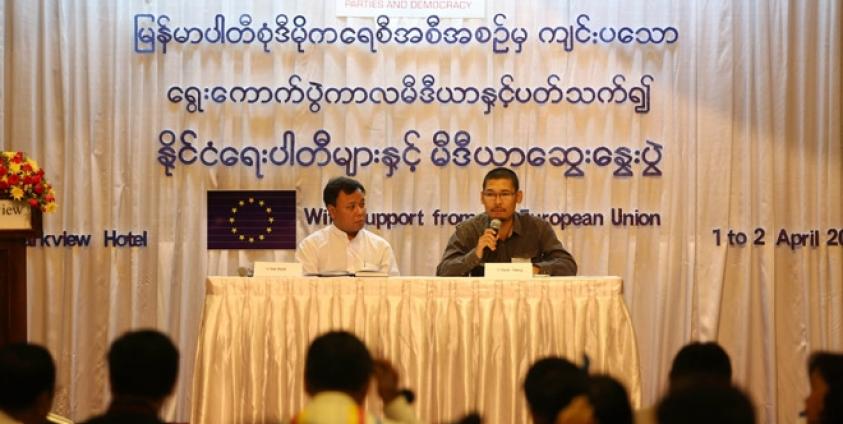 မြန်မာပါတီစုံ ဒီမိုကရေစီအစီအစဉ်မှ ကျင်းပသော ရွေးကာက်ပွဲကာလ မီဒီယာနှင့် နိုင်ငံရေးပါတီများ ချိတ်ဆက်လုပ်ဆောင်နိုင်ရန် ဧပြီ ၁ရက်က ရန်ကုန်မြို့ရှိ Summit Park View hotel တွင် ကျင်းပနေစဉ်။(ဓာတ်ပုံ-သက်ကို)