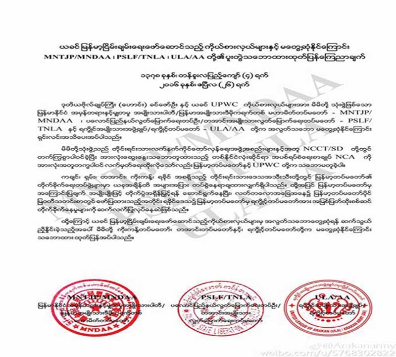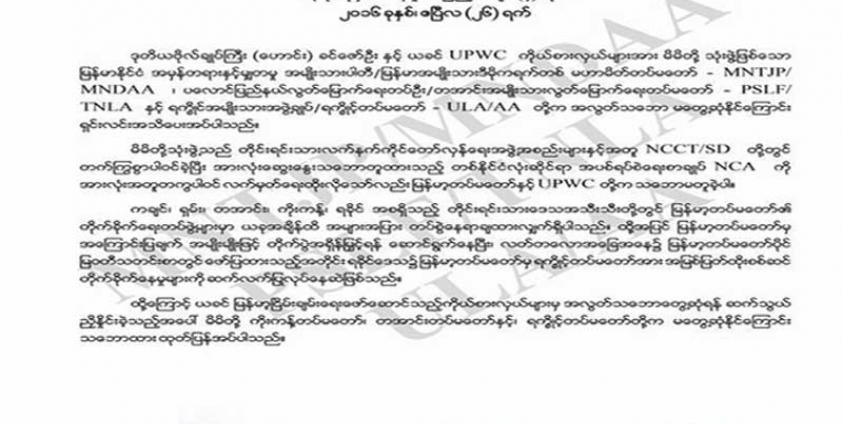 မြန်မာအမျိုးသားဒီမိုကရက်တစ် မဟာမိတ်တပ်မတော် - MNDAA ၊ တအာင်းအမျိုးသား လွတ်မြောက် ရေးတပ်မတော် - TNLA နှင့် ရက္ခိုင့်တပ်မတော် - AA တို့ သုံးဖွဲ့သည် တိုင်းရင်းသား လက်နက်ကိုင် တော်လှန်ရေးအဖွဲ့ အစည်းများနှင့်အတူ တစ်နိုင်ငံလုံးဆိုင်ရာ အပစ်ရပ်စဲရေးစာချုပ် NCA ကို အားလုံးအတူတကွ ပါဝင် လက်မှတ်ရေးထိုး လိုသော် လည်း မြန်မာ့တပ်မတော်နှင့် UPWC တို့က သဘောမတူခဲ့ကြောင်း ထုတ်ပြန်ချက်တွင်ပါရှိသည်။