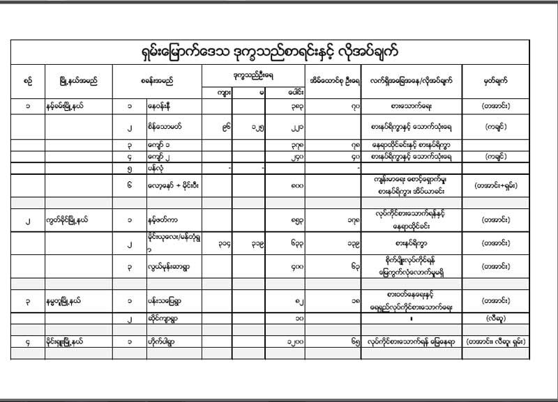 စစ်ဘေးရှောင်များမှာ ရှမ်း/မြောက် မန်တုံ၊ နမ့်ခမ်း၊ ကွတ်ခိုင်၊ နမ္မတူ၊ ကျောက်မဲ၊ လောက်ကိုင်၊ ရှမ်း/တောင် မိုင်းရှူးတို့တွင်ခိုလှုံ လျက်ရှိပြီး လာမည့် မိုးကာလအတွက် စားနပ်ရိက္ခာများ၊ သွပ်မိုး၊သောက်ရေ၊ နေရာထိုင်ခင်း နှင့် ပြန်လည်ထူထောင်ရေးအတွက် ငွေကြေးထောက်ပံ့မှုများ လိုအပ်နေကြောင်း စခန်းတာဝန်ခံ၏ ပြောပြချက်ရ သိရသည်။