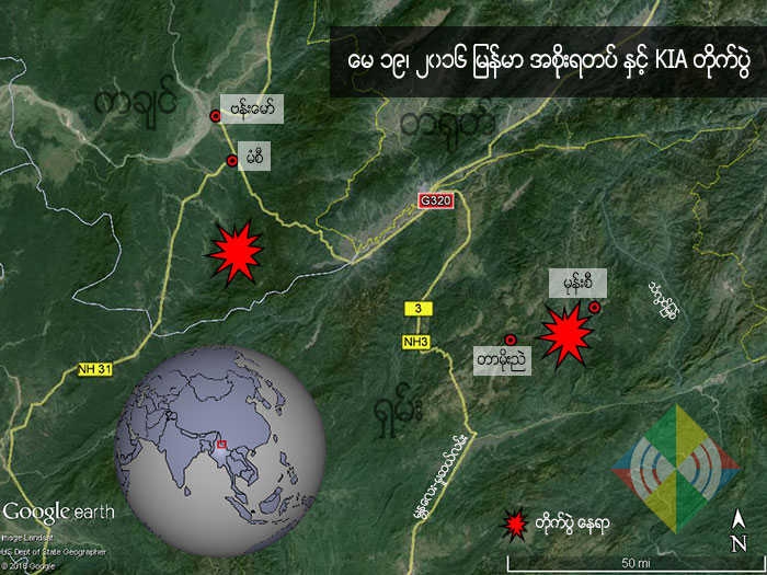 မြန်မာ အစိုးရတပ်နှင့် ကချင် လွတ်လပ်ရေး တပ်မတော် KIA ကြား ကချင်ပြည်နယ်နှင့် ရှမ်းပြည်နယ် မြောက်ပိုင်း ဒေသ နှစ် ခုတွင် မေ ၁၉၊ ယနေ့ တိုက်ပွဲများ ဖြစ်ပွားနေသည်။