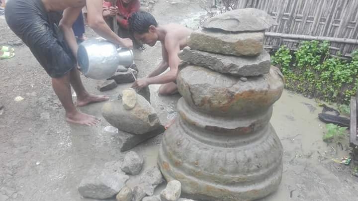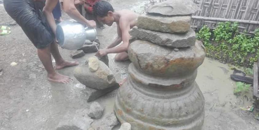 အပေါက်ဝကျေးရွာတွင် မြစ်ကမ်းပါးပြိုရာမှ ရှေးဟောင်းကျောက်ဆင်းတု စတုပါစေတီများ တွေ့ရှိ