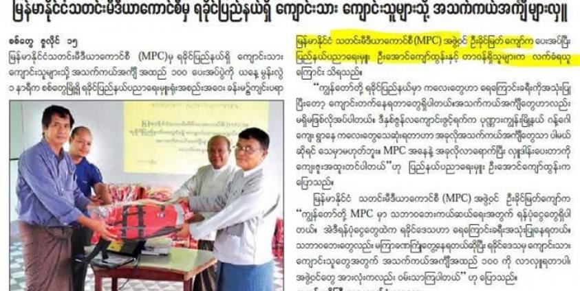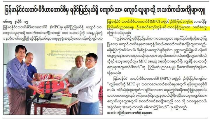 “ဒီအသက်ကယ် အကျႌတွေဟာ မြန်မာသတင်းမီဒီယာကောင်စီရဲ့ ရေဘေးသင့် ပြည်သူတွေကို ကူညီမယ့် ဘတ်ဂျက်ထဲက ကူညီတာဖြစ်ပါတယ်။ ရခိုင်ပြည်နယ် ပုဏ္ဏားကျွန်းမြို့နယ် ပိုးရွှီပြင်ကျေးရွာ အထကမှ ကျောင်းသားတွေ ရေနစ်သေဆုံးမှုကို သူတို့ကြားရတဲ့အခါ အလွန် စိတ်မကောင်းဖြစ်ကြပါတယ်။ အဲ့ဒါကြောင့် သူတို့မှာရှိတဲ့ ဘတ်ဂျက်ထဲက အသက်ကယ်အကျႌအထည် ၁၀၀ ကို ရခိုင်ဒေသမှာရှိတဲ့ ကျောင်းသားတွေ အတွက် အခုလို လှူဒါန်းရခြင်းဖြစ်ပါတယ်”ဟု ဆိုသည်။