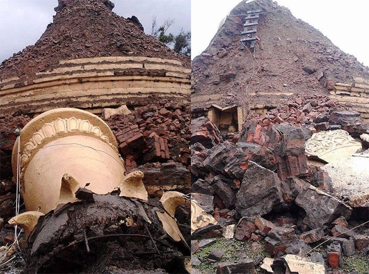 ဘုရားဂေါပက ဦးအောင်ကျော်စိန်မှ မိုးသည်းထန်စွာ ရွာသွန်းမှုကြောင့် စေတီတော်ရှိ အက်ကွဲကြောင်းများ အတွင်း ရေစိမ့်ဝင်ကာ ကွဲထွက်ပြိုကျရခြင်း ဖြစ်နိုင်ကြောင်း ပြောကြားသည်။