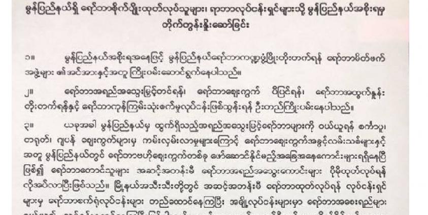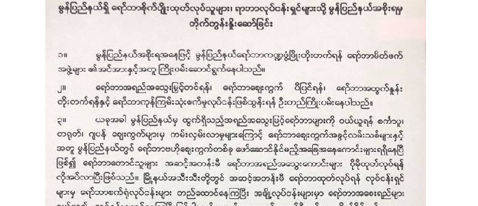 ရာဘာကဏ္ဍဖွံ့ဖြိုးတိုးတက်ရေးအတွက် အရည်အသွေးကောင်း ရော်ဘာများ ပိုမိုထုတ်လုပ်နိုင်ရန်နှင့် ရော်ဘာအထွက်နှုန်းတိုးတက် ပိုမိုကောင်းမွန်လာအောင် ဆောင်ရွက်ရမည်ဟု နိုဝင်ဘာ ၂၁ ရက်နေ့တွင် မွန်ပြည်နယ်အစိုးရက ထုတ်ပြန်လိုက်သည့် တိုက်ထွန်းချက်တွင် ပါရှိသည်။