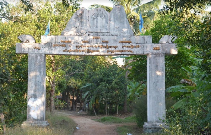 ရွာထဲကိုဝင်ဝင်ချင်းမှာပဲ အရင်တွေ့ရမှာက ရွာဦးမုဒ်ဝပါပဲ။ မုဒ်ဝဝင်ပြီး အိမ် ၂ လုံးကျော်တာနဲ့ ရွာအဝင် ဓမ္မာရုံကြီးကို စတွေ့ရမှာဖြစ်ပြီး ဆောက်ထားတဲ့ ဓမ္မာရုံကြီးကလည်း တစ်မူထူးခြားပါတယ်၊ မြင်နေကျ ထောင့် ၄ ထောင့်ရှိတဲ့ ဓမ္မာရုံလို မဟုတ်ပါဘူး။ ထောင့် ၃ ထောင့်သာရှိပြီး ပိရမစ်ပုံစံ မျိုးဆောက် လုပ်ထားပါတယ်။ အဆောက် အဦးခေါင်မိုးရဲ့ အချွန်ထိပ်မှာတော့ စေတီထီးတော်လိုမျိုး တင်ထားတဲ့အတွက် အမြင်တစ်မျိုး ဆန်းစေပါတယ်။