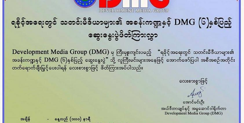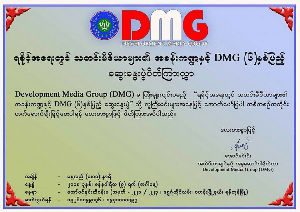 ရခိုင့်အရေးတွင် သတင်းမီဒီယာများ၏ အခန်းကဏ္ဍနှင့် DMG (၆) နှစ်မြောက်ဆွေးနွေးပွဲ ရန်ကုန်တော်ဝင်နှင်းဆီခန်းမတွင်ပြုလုပ်မည်