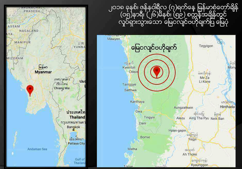 ရခိုင်ပြည်နယ်၊ ဂွမြို့အရှေ့မြောက်ဘက် မိုင် ၂ဝ ခန့်အကွာအား ဗဟိုပြု၍ အင်အားအနည်းငယ်ရှိ မြေငလျင် တစ်ခု  ဇန်နဝါရီလ ၇ ရက်၊ နံနက် ၅ နာရီ၂၆ မိနစ်၊ ၅၉ စက္ကန့်တွင် လှုပ်ခတ်သွားကြောင်း မိုးလေဝသ နှင့် ဇလဗေဒညွှန်ကြားမှုဦးစီးဌာန၊ နေပြည်တော် မြေငလျင်ဌာနခွဲမှ လက်ထောက်ညွှန်ကြားရေးမှူး ဒေါက်တာ ယဉ်မျိုးမင်းထွေးက မဇ္စျိမသို့ပြောသည်။