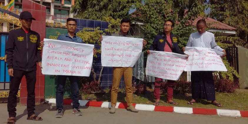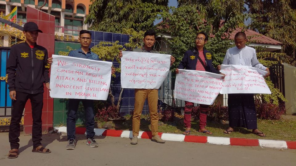 ရခိုင်ပြည်နယ် မြောက်ဦးမြို့တွင် လူ ၇ ဦးသေဆုံးခဲ့ရသည့် ပစ်ခတ်မှုအား အမြန်ဖော်ထုတ်ပြီး သက်ဆိုင်သူများကို ပြင်းထန်စွာ အရေးယူရန် ရခိုင်ပြည်နယ် အစိုးရရုံးရှေ့တွင် လူငယ် ၅ ဦးမှ ပိုစတာများကိုင်ဆောင်ပြီး တောင်းဆိုခဲ့ကြသည်။