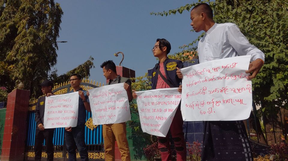 ဓာတ်ပုံ- စစ်တွေမြို့ ပြည်နယ် အစိုးရရုံးရှေ့တွင် ယခုလ ၁၇ ရက်နေ့က ကန့်ကွက်ဆန္ဒပြ၍ အမှုဖွင့်ခံရသူ လူငယ် ၅ ဦး