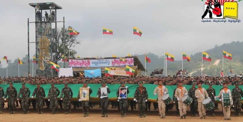 ရာချီတဲ့ စစ်ရေးပြနေတဲ့ သျှမ်းစစ်သားရဲ့ ထိပ်ဆုံး မှာတော့ သူတို့ အလေးအမြတ်ထားတဲ့ ခေါင်းဆောင်ကြီး ဗိုလ်ချုပ်ကြီး ယွက်ဆစ်ရဲ့ ဓာတ်ပုံမှန်ဘောင် ၃ ခု ကို ကိုင်ထားကြပါတယ်။