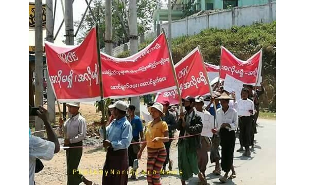 ရခိုင်ပြည်နယ် အမ်းမြို့တွင် လယ်သမား ၁၀၀၀ ခန့်က သူတို့၏ ပျက်စီးသွားသော လယ်မြေများ၊ ဥယျာဉ်ခြံမြေများအတွက် လျော်ကြေးပေးရန် ပျက်ကွက်သဖြင့် တရုတ်ရေနံကုမ္ပဏီ CNPC နှင့် မြန်မာ ရေနံနှင့် သဘာဝဓာတ်ငွေ့ လုပ်ငန်း MOGE တို့ကို ယမန်နေ့ (မတ်လ ၂၂ ရက်နေ့)တွင် ကန့်ကွက် ဆန္ဒပြခဲ့ကြသည်။