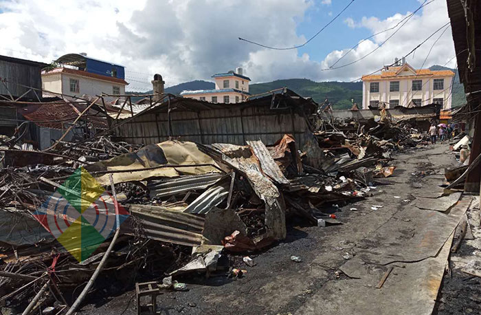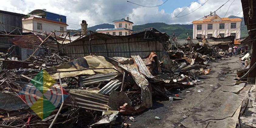 စျေးဆိုင် တိုက်တန်းများ မီးလောင်မှုကြောင့် စျေးဆိုင်နှင့် စတိုးဆိုင်များ အားလုံးနီးပါး ပျက်စီးခဲ့ရကြောင်း ဒေသခံများ ကချင်သတင်းဌာန KNG ကို ပြောသည်။