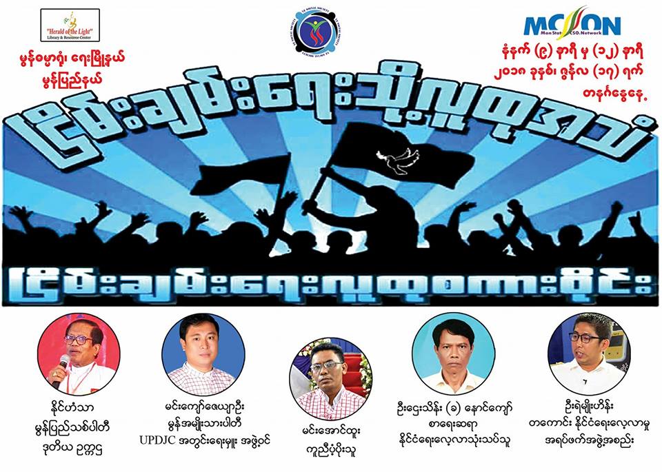 ငြိမ်းချမ်းရေး လုပ်ငန်းစဉ်ကြီးတစ်ခုလုံးကို ပြည်သူလူထု သိရှိစေရန်၊ ငြိမ်းချမ်းရေးလုပ်ငန်းစဉ်တွင် ပြည်သူလူထုမှ ပူးပေါင်းပါဝင်ရန်နှင့် ပြည်သူ့အသံ ဖော်ပြနိုင်ရန်ရည်ရွယ်ချက်ဖြင့် မွန်ပြည်နယ်၊ ရေးမြို့၊ မွန်ဓမ္မာရုံ၌ မေလ ၁၇ ရက်နေ့(တနင်္လာနေ့) တွင် ငြိမ်းချမ်းရေးလူထုစကားဝိုင်း ကျင်းပပြုလုပ်မည် ဖြစ်ကြောင်း စီစဉ်သူများထံမှသိရသည်။