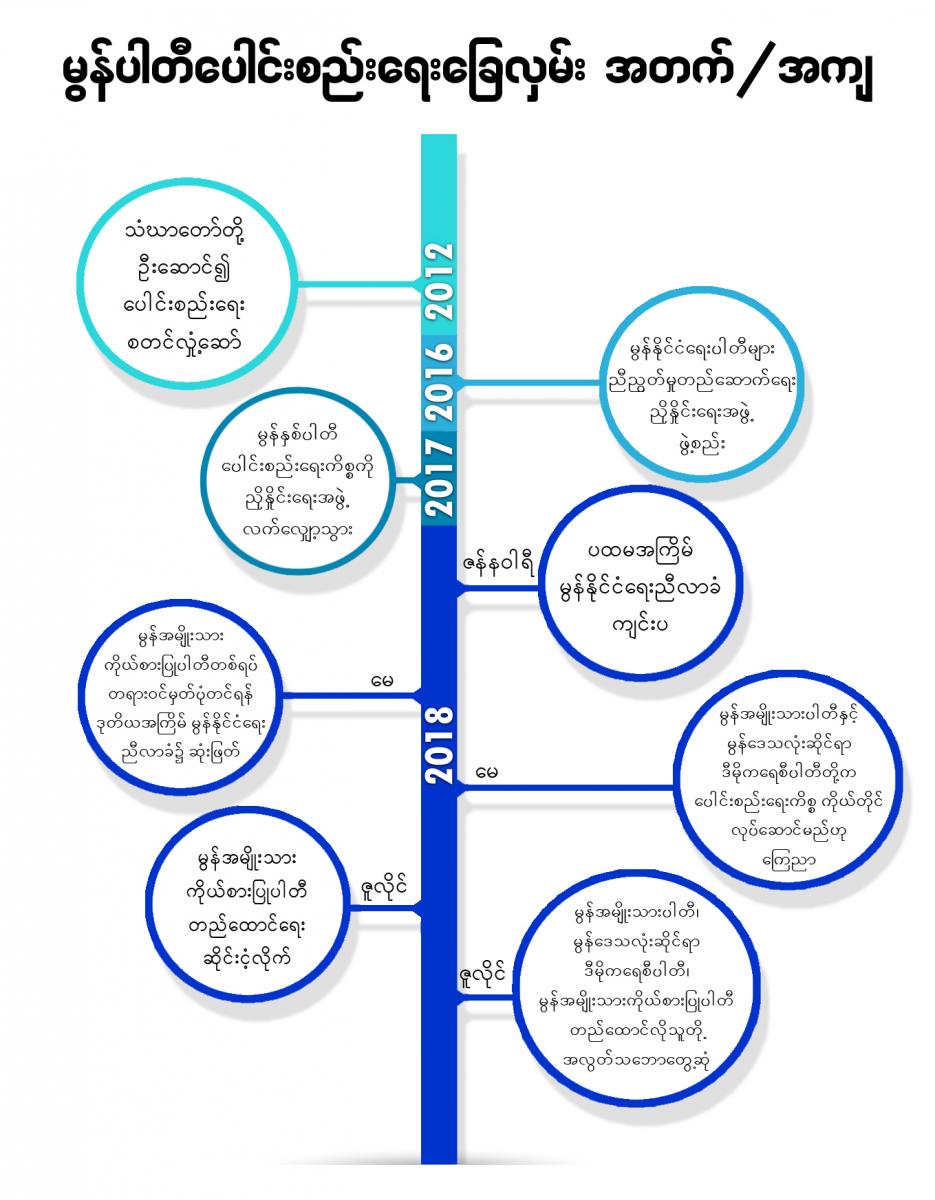 မွန်နိုင်ငံရေး ပါတီများ ပေါင်းစည်းရေးအတွက် ၂၀၁၂ ခုနှစ်ကတည်းက စတင် ကြိုးပမ်းခဲ့သည်။ သို့သော်လည်း အခြေအနေ အရပ်ရပ်ကြောင့် အောင်မြင်မှု မရရှိခဲ့ဘဲ ၂၀၁၅ ရွေးကောက်ပွဲကို ဖြတ်သန်းရာ အထက်ပါအဖြစ်မျိုးနှင့်ကြုံခဲ့ရသည်။