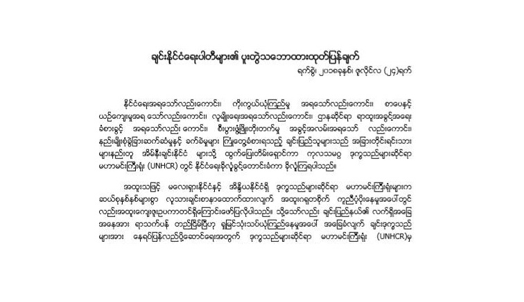 ကုလသကုမဂ္ဂ ဒုက္ခသည်များဆိုင်ရာ မဟာမင်းကြီရုံးသည် ပြီးခဲ့သည့် ဇွန်လက ကြေညာချက်တစ်စောင်ထု တ်ပြန်ကာ မလေးရှားနှင့် နယူးဒေလီရှိ ချင်းဒုက္ခသည်များဆိုင်ရာ အဖွဲ့အစည်းအား ခေါ်ယူတွေ့ဆုံးပြီး ချင်းလူမျိူးများအပေါ် ၎င်းတို့ဆုံးဖြတ်ချက်ကို ချပြရှင်းလင်းခဲ့ခြင်းဖြစ်သည်။
