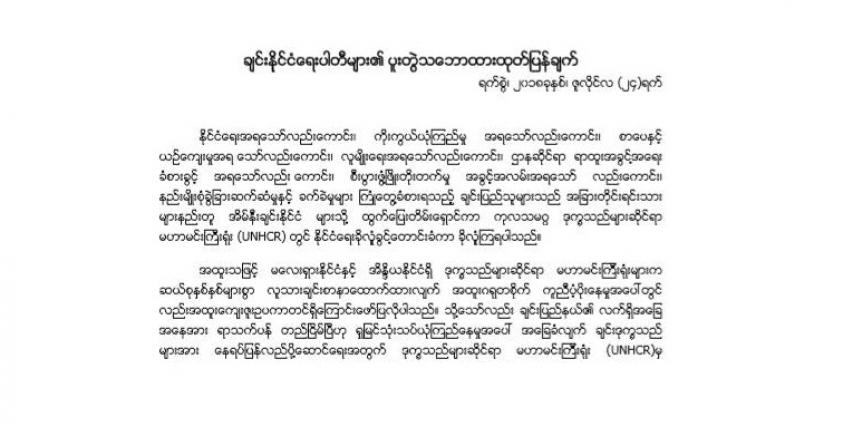 ချင်းပြည်နယ်တွင် နိုင်ငံရေး၊ လူမှုရေး နှင့် လုံခြုံရေးအခြေအနေ တိုးတက်မှုများရှိလာသည့်အတွက် မလေးရှားနှင့် အိန္ဒိယနိုင်ငံသို့ရောက်ရှိနေကြသည့် ချင်းလူမျိူးများကို ဒုက္ခသည်အဖြစ် ခိုလုံခွင့်ပေးတော့မည်မဟုတ်ကြောင်း ကုလသကုမဂ္ဂ ဒုက္ခသည်များဆိုင်ရာ မဟာမင်းကြီရုံး (UNHCR) ၏ ဆုံးဖြတ်ချက်ကို ချင်းနိုင်ငံရေးပါတီ (၆) ခုမှ ဇူလိုင် (၂၄) ရက်နေက ကြေညာချက်တစ် စောင်ထုတ်ပြန်ပြီး ကန့်ကွက်လိုက်ကြသည်။