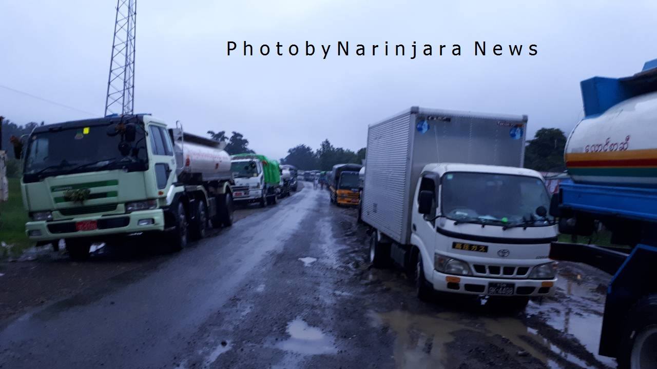 ခရီးသည်တင် ဘတ်စ်ကားများ၊ ကုန်တင်ကားများ လုံးဝ ရပ်နားထားရကြောင်း၊ ခရီးသည်များမှာ ထမင်းဆိုင်များတွင် နားနေရကြောင်း၊ စစ်တွေ-ရန်ကုန်ကားလမ်းပိတ်နေသည်မှာ ၂ ရက် ( ဇူလိုင် ၂၄-၂၅ ရက်နေ့ )ခန့်ရှိနေပြီ ဖြစ်ကြောင်း၊ ရန်ကုန်နှင့် မန္တလေးဘက်မှာ လာသောကားများနှင့် စစ်တွေဘက်မှ ရန်ကုန်-မန္တလေးဘက်သို့ သွားသည့်ကားများမှာ ဟိုဘက် ဒီဘက် ပိတ်မိနေကြောင်း၊ ပိတ်မိသော ဘတ်စ်ကား၊ ကုန်တင် ကားအရေအတွက်မှာ ၂၀၀ ခန့်ရှိကြောင်း ဦးမောင်ဝင်းရွှေက ဆက်လက် ပြောကြားသည်။