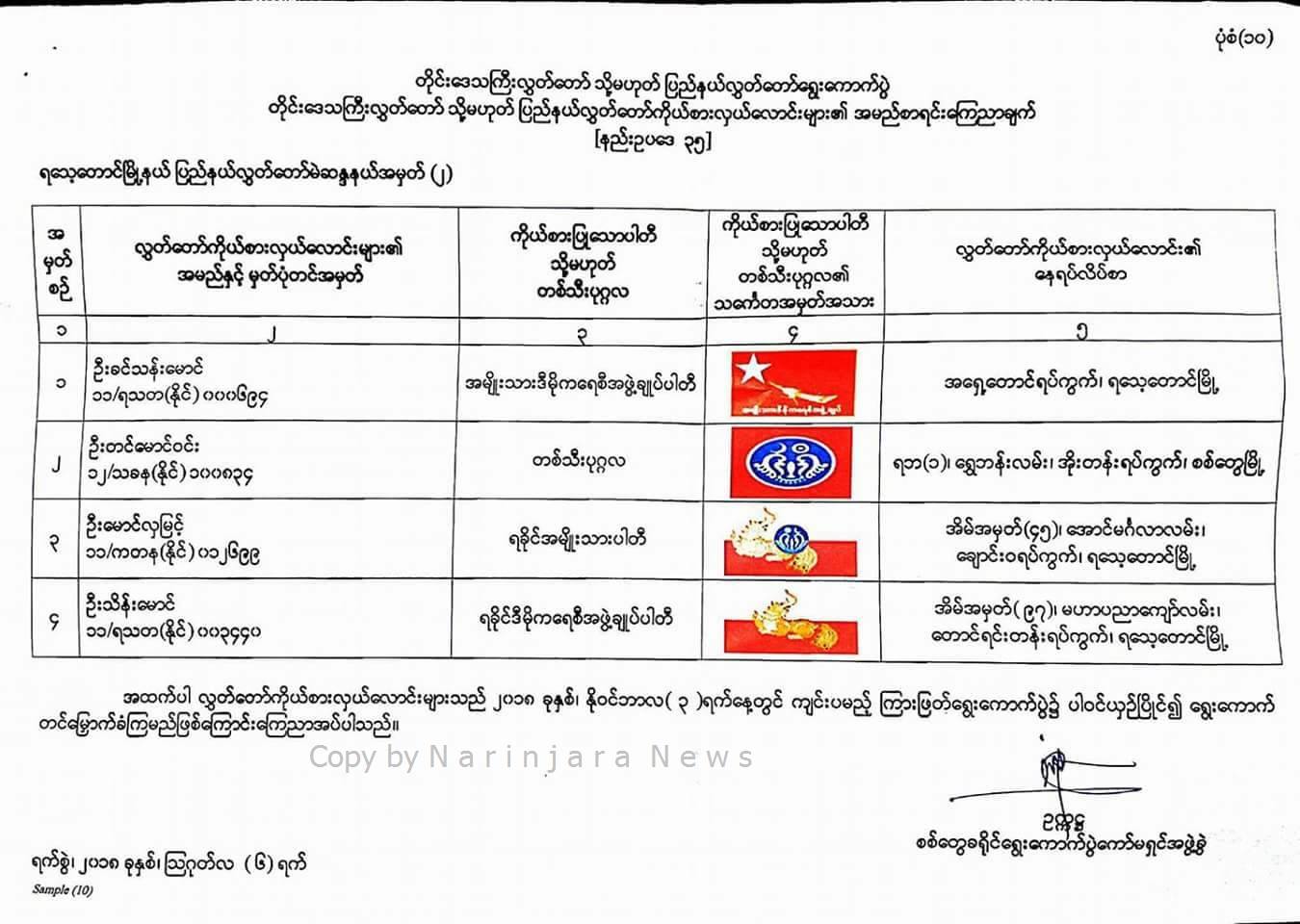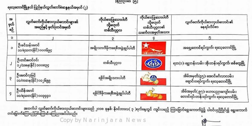ကြားဖြတ်ရွေးကောက်ပွဲ၌ ရသေ့တောင်မြို့နယ်မှ ပါဝင်ယှဉ်ပြိုင်မည့် ကိုယ်စားလှယ်လောင်းများ၏ အမည်စာရင်း ထုတ်ပြန်ကြေညာ