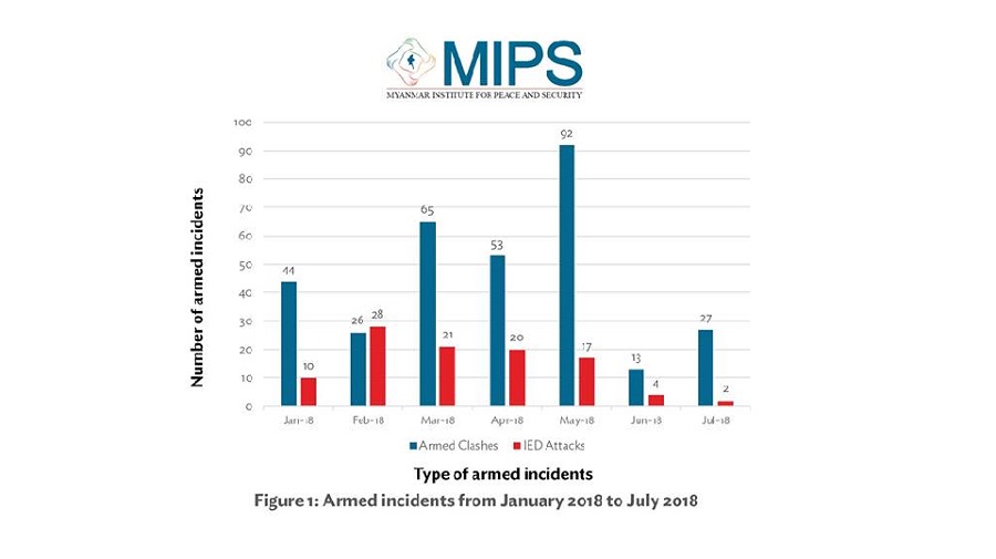 MIPS ၏ မြို့နယ်အဆင့် ပဋိပက္ခ စောင့်ကြည့်ရေး အချက်အလက် ဒေတာဘေ့စ် Township-based Conflict Monitoring System Database မှတ်တမ်းအချက်အလက်များအရ ပြီးခဲ့သည့် ဇွန်လတွင် လက်နက်ကိုင် ပဋိပက္ခ Armed Incidents ၁၇ ကြိမ် ဖြစ်ပွားခဲ့သည်ဟု ဆိုသည်။