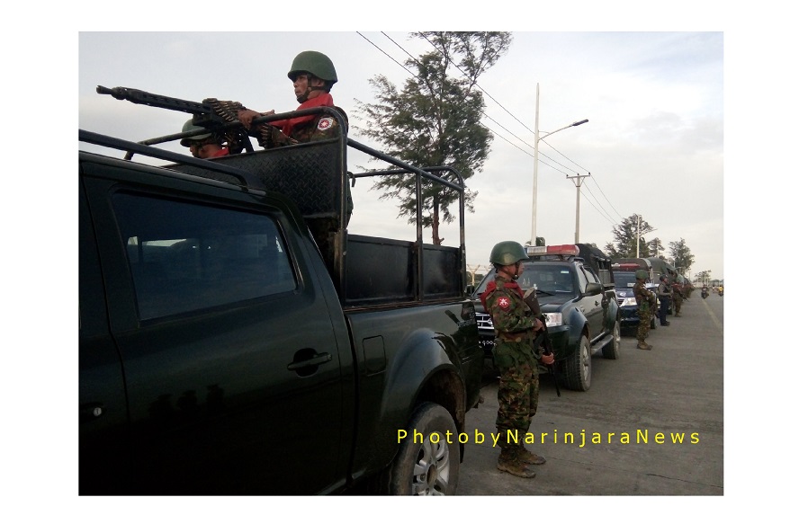 ၎င်းလုံခြုံရေးကားတန်း အနီးသို့ ရောက်နေသည့် နိရဥ္စရာမှ လက်ထောက် အယ်ဒီတာ စံမောင်သန်းကို ဆက်သွယ်ရာ သူက “ စစ်သားနဲ့ ရဲသားက ၃၀၀ ကျော်လောက်ပါပါတယ်။ စစ်ကားက ၂၀ ခန့်၊ ရဲကားက တစ်ဆယ်ကျော်၊ စုစုပေါင်း ၃၀ ကျော်ပါဝင်ပါတယ်။ ရဲတပ်ဖွဲ့ ဘက်မှ ရခိုင်ပြည်နယ် ရဲတပ်ဖွဲ့မှူး ရဲမှူးကြီး အောင်မြတ်မိုးနဲ့ တပ်မတော်ဘက်မှ ဗိုလ်ချုပ်အဆင့်ရှိ အရာရှိကြီးတစ်ဦးတို့က ဦးဆောင်ပါဝင်ပြီး ဆောင်ရွက်နေတာကို တွေ့ရပါတယ်” ဟု ပြောကြားသည်။
