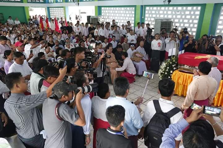 ရန်ကုန်မြို့ ရေဝေးသုဿာန်၌ အောက်တိုဘာ ၆ ရက်နေ့က ကျင်းပခဲ့သော နိုင်ငွေသိမ်း စျာပနအခမ်းအနားတွင် ဝါရင့်နိုင်ငံရေးသမားများ၊ အစိုရအဖွဲ့ဝင်များ၊ လွှတ်တော်ကိုယ်စားလှယ်များ၊ တိုင်းရင်းသားခေါင်းဆောင်များ၊ နိုင်ငံရေးပါတီခေါင်းဆောင်များ၊ မွန်တိုင်းရင်းသားများနှင့် ကျန်ရစ်သူမိသားစုနှင့် ဆွေမျိုးသားချင်းများ တက်ရောက်ကြသည်ကို တွေ့ရသည်။