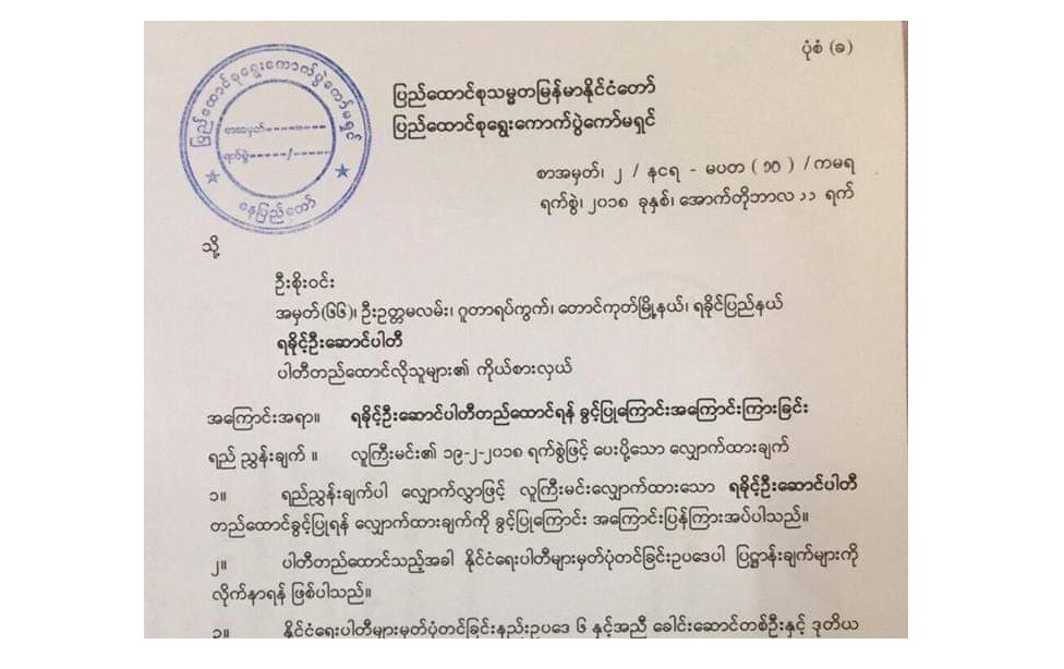 ပါတီတည်ထောင်ခွင့်အကြောင်းကြားစာကို ပြည်ထောင်စုရွေးကောက်ပွဲကော်မရှင်က ဦးစိုးဝင်းထံသို့ လိပ်မူပေးပို့လိုက်ခြင်းဖြစ်ပြီး ပါတီခေါင်းဆောင်တစ်ဦးနှင့် ဒုတိယခေါင်းဆောင်တစ်ဦးတို့အား ရက်ပေါင်း ၃ဝ အတွင်း အမြန်ဆုံးရွေးချယ်တင်ပြရမည်ဟုလည်း တည်ထောင်ခွင့်ပြုသည့်အကြောင်းကြားစာတွင် ဖော်ပြထားသည်။