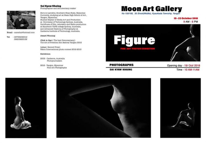 အဆိုပါ Fine Art Nude Photos ဓါတ်ပုံ – ပန်းချီများမှာ သြစတေးလျပြန် ဓါတ်ပုံဆရာ စိုင်းကျော်ခိုင် နှင့် ပန်းချီ ကာတွန်းဆရာ ဟန်လေး တို့ ၏ အနုပညာလက်ရာများဖြစ်ကြပြီး အောက်တိုဘာလ ၁၉ ရက်နေ့မှ ၂၃ ရက်နေ ့အထိ ရန်ကုန်မြို့ ကျောက်တံခါးမြို့နယ်ရှိ Moon Art Gallery တွင်ပြသသွားမည်ဖြစ်ကြောင်း သိရသည်။