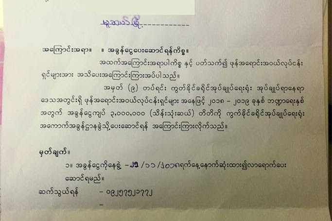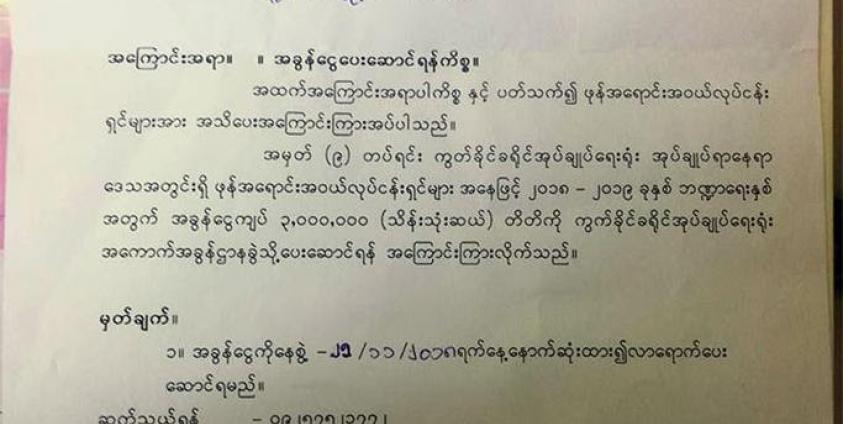 အကြောင်းကြားစာ တစ်ခုတွင်မူ နိုဝင်ဘာ ၂၅ ရက်နေ့ နောက်ဆုံးထား၍ ကွတ်ခိုင်ခရိုင် အုပ်ချုပ်ရေးမှူးရုံး၊ အကောက်ခွန်ဌာနခွဲသို့ လာရောက်ပေးဆောင်ရမည်ဟု ဖော်ပြပါရှိသည်။