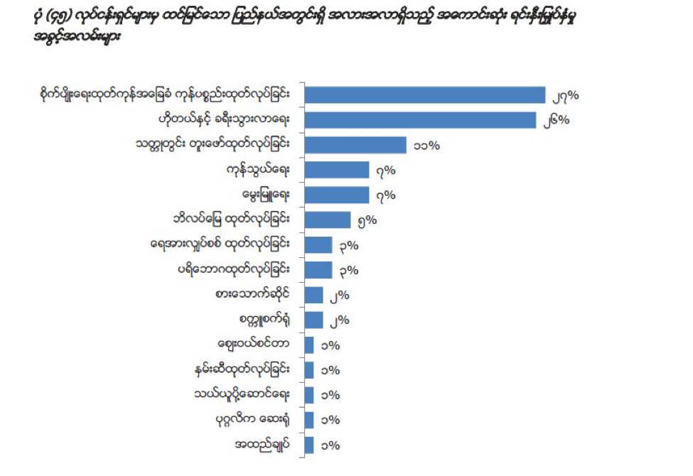 ကယားပြည်နယ် ရင်းနှီးမြှုပ်နှံမှု အခွင့်အလမ်း ဆိုင်ရာ စစ်တမ်းအရ စိုက်ပျိုးရေးနှင့် ဆက်စပ် စီးပွားရေးလုပ်ငန်းသည် ရာခိုင်နှုန်းအများဆုံးဖြစ်သည်ကိုလည်း အောက်ပါ အချက်အလက်တွင် တွေ့ရသည်။