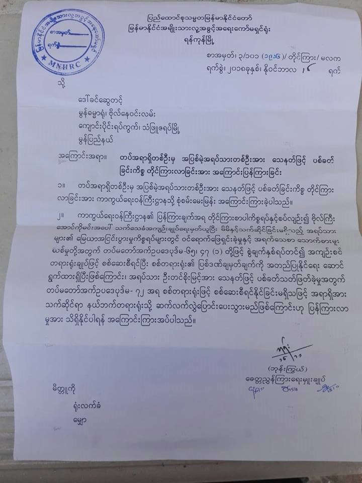 ရန်ကုန်မြို့ရှိ မြန်မာနိုင်ငံအမျိုးသားလူ့အခွင့်အရေးကော်မရှင်ရုံး၏ အကြောင်းကြားစာတွင် ကာကွယ်ရေးဝန်ကြီးဌာန၏ ပြန်ကြားချက်အရ အရပ်သား ဦးတင်စိုးမြင့်အား သေနတ်ဖြင့် ပစ်ခတ်သတ်ဖြတ်ခဲ့မှုအတွက် တပ်မတော်အက်ဥပဒေပုဒ်မ- ၇၂ အရ စစ်တရားရုံးဖြင့် စစ်ဆေးစီရင်နိုင်ခြင်းမရှိသဖြင့် အရာရှိအား သက်ဆိုင်ရာ နယ်ဘက်တရားရုံးကို ဆက်လက်လွှဲပြောင်းပေးသွားမည်ဖြစ်ကြောင်း ဖော်ပြပါရှိသည်။