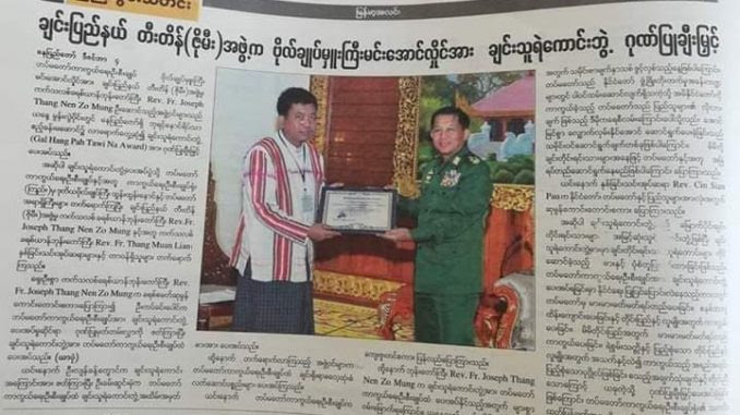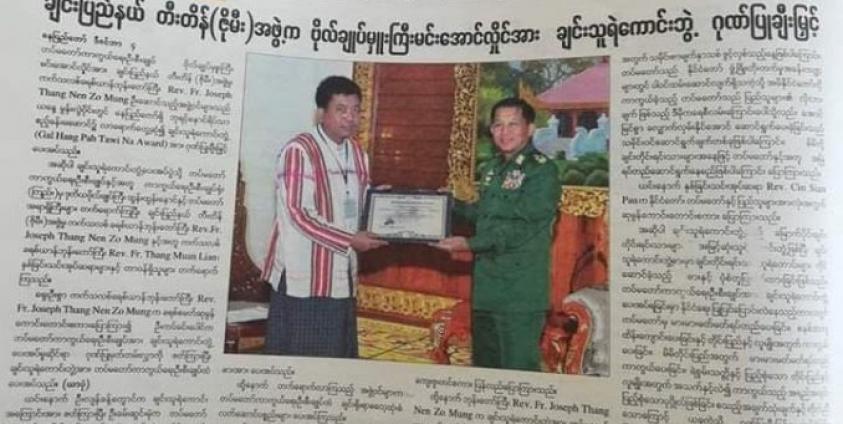 ဗိုလ်ချုပ်မှူးကြီးမင်းအောင်လှိုင်ကို ချင်းပြည်နယ်တီးတိန်(ဇိုမီး)အဖွဲ့မှ ကက်သလစ်ခရစ်ယာန် ဘုန်းတော်ကြီး Rev.Fr. Joseph Thang Nen Zo Mung ဦးဆောင်သည့် အဖွဲ့ဝင်များမှ ဒီဇင်ဘာ (၄)ရက်နေ့တွင် နေပြည်တော်ရှိ ဘုရင့်နောင် ရိပ်သာ၊ ဧည့်ခန်းမဆောင်၌ လာရောက်တွေ့ဆုံပြီး သူရဲကောင်းဘွဲ့ (Gal Hang Pah Tawi Na Award) ဂုဏ်ပြုချီးမြှင့်ခဲ့ကြောင်း နိုင်ငံပိုင်သတင်းစာတွင် ဒီဇင်ဘာလ (၅) ရက်နေ့က ဖော်ပြခဲ့သည်။