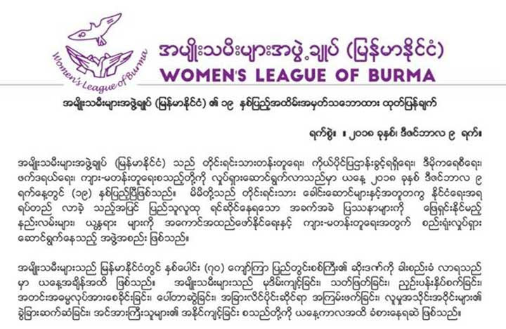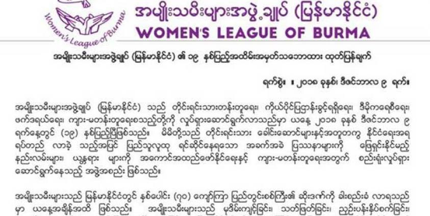 ရေရှည်တည်တံ့ခိုင်မြဲသည့် ငြိမ်းချမ်းရေး ကို တည်ဆောင်နိုင်ရန် အတွက် တိုင်းရင်းသား ဒေသအသီးသီး တွင် စစ်ပွဲများရပ်တန့်ရန် အမျိုးသမီး များအဖွဲ့ချုပ် (မြန်မာ နိုင်ငံ) က တောင်းဆိုလိုက်သည်။