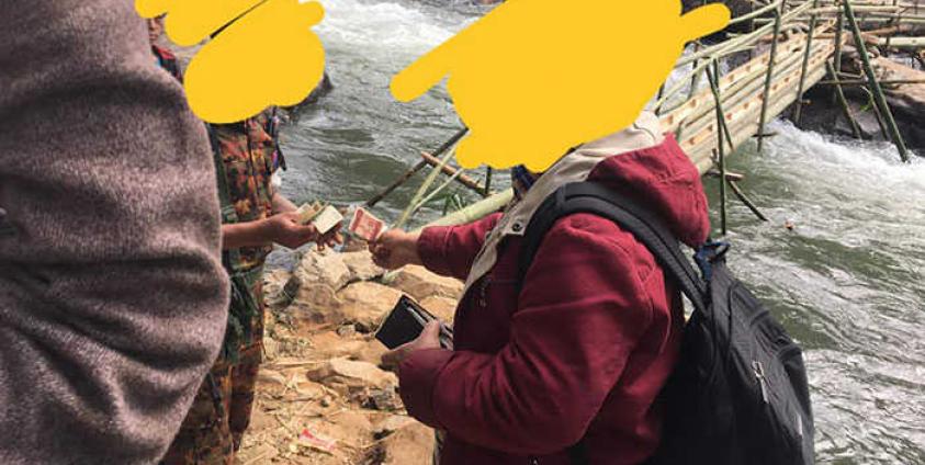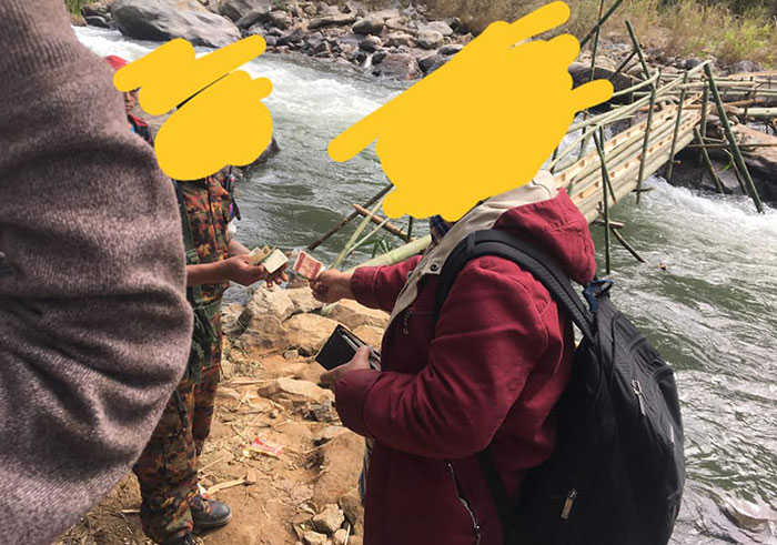 ခရီးသည်များ သွားလာနိုင်ရန် နယ်ကြားစောင့်တပ်မှ ယာယီဝါးတံတားကို ဆောက်လုပ်ထားပြီး သွားလာဖြတ်သန်းနိုင်ရန် တစ်ယောက်ကို ကျပ် ၁၀၀၀ နှုန်း ကောက်ခံနေပြီး ကူလီအလုပ်သမားများကလည်း လက်ဆွဲအိတ် တစ်အိတ်တွင် ကျပ် ၅၀၀၀ နှုန်းဖြင့် ကောက်ခံနေသည်ဟု ခရီးသည်တစ်ဦးက ကချင်သတင်းဌာန KNG သို့ ပြောပြသည်။