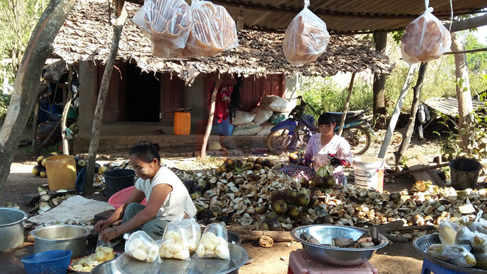 သားသမီးတွေ အိမ်ထောင်ကျကုန်လို့ သူမအနားမှာ မကူပေးနိုင်ကြတော့ ဆယ်ကျော်သက်အရွယ် တူမလေးနဲ့အတူ သနပ်ခါး ပါးကွက်ကြားလေးနဲ့ အေးချမ်းတဲ့ မျက်နှာပိုင်ရှင် နန်းဖောင်ဟာ ထန်းခိုင်၊ ထန်းသီးတွေ၊ ခုတ်ပြီးသား ထန်းသီးအခွံပုံတွေကြားမှာ ဓားတစ်လက်နဲ့ ထန်းသီးကို တစ်မွှာချင်း ရလာအောင် ခုတ်ထစ်ပြီး ရေစိမ်နေပါတယ်။
