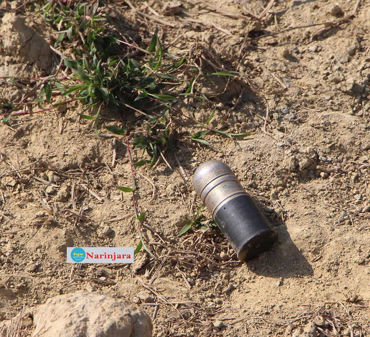 ဇန်နဝါရီ ၃၀ ရက်နေ့က ရိုက်ယူခဲ့သည့် အုန်းချောင်းရွာဝင်၀ လမ်းဘေးရေမြောင်းတွင် မပေါက်ကွဲဘဲ ကျန်နေသည့် လက်နက်ကြီးကျည်နှင့် ပျက်စီးသွားသည့် ဓမ္မာရုံ