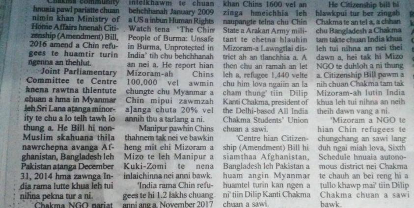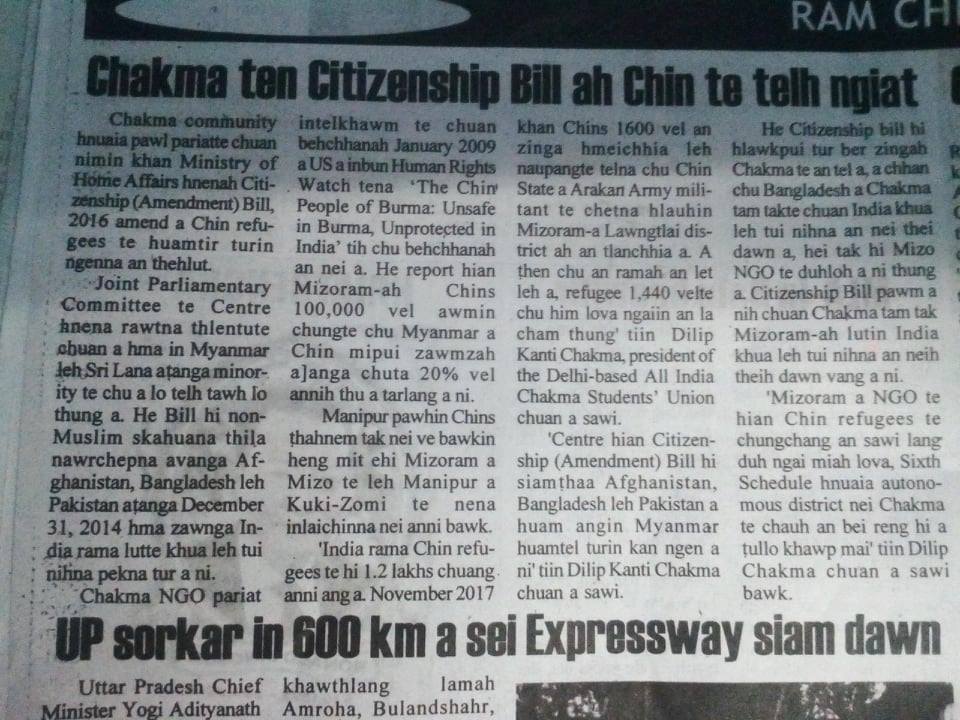အိန္ဒိယနိုင်ငံသားဖြစ်ခွင့်ဥပဒေပြင်ဆင်ချက် Citizenship (Amendment) Bill, 2016 တွင် ချင်းလူမျိုးများလည်း ပါဝင်ထည့်သွင်းရန် Chakma community လက်အောက်ရှိ အဖွဲ့ (၈) ခု ပူးပေါင်းပြီး အိန္ဒိယနိုင်ငံ ပြည်ထဲရေးဝန်ကြီးထံ ဇန်နဝါရီလ (၃၀) ရက်နေ့က တောင်းဆိုလိုက်သည်။